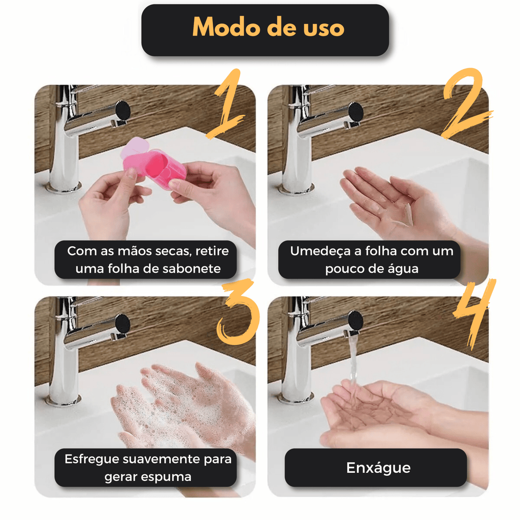 Simples! Pegue uma folha, molhe com água, esfregue nas mãos para formar espuma e enxágue.