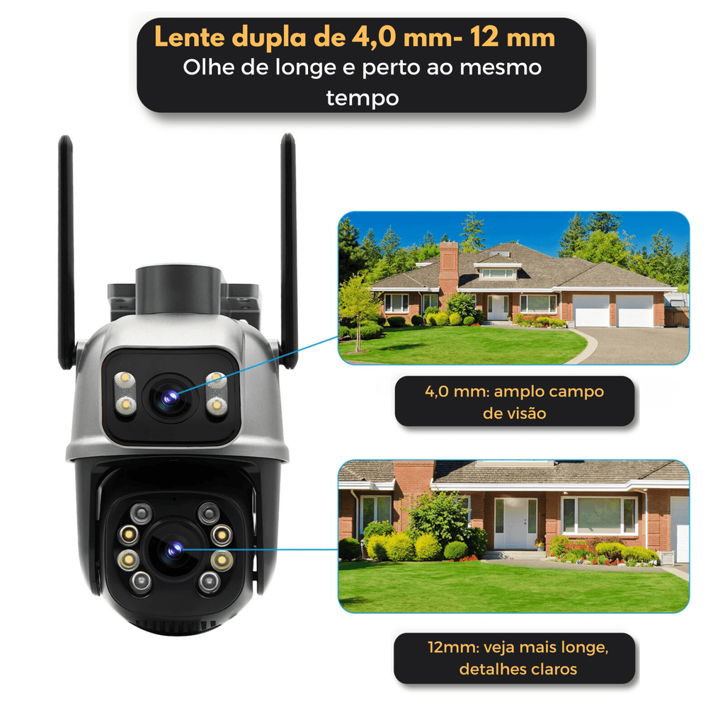 Com lente dupla de 4.0 mm e 12 mm, você vê de longe e de perto com nitidez! Cada detalhe do que acontece ao redor da sua casa estará ao seu alcance. 📷✨
